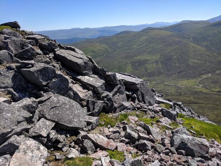 The hike up Schiehallion is extremely forgiving for a Munro (obviously based on my vast experience) because so much of it is a constant gradient up the spine of the hill. There aren’t many sudden steep gradients so you get into a total rythm. Then come the boulders which on the way up were incredible fun. The sun and heat meant the boulders were bone dry, stable and safe so we hopped between them with total confidence. I’d have hated to do it in rain or snow. My friends would have been fine but I am obscenely clumsy and I’d have needed to wear a helmet. We also lost the path going up because we were having too much fun boulder hopping so we were grateful our navigation wasn’t tested by poor visibility.