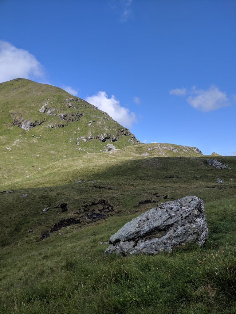 Another advantage to the route we took was that we caught the valley at the north of the Lawers range in possibly the best light during the day. The weather had been godamn stunning but it was partly cloudy as we walked up and the constantly shifting light and shadow was mesmerising at times because the hills at the back appear relatively smooth and uniform but they aren’t. They’re complex and layered and interesting in a way my camera couldn’t quite capture and with every few steps along the path you could look up after that 20 seconds and the light would have changed and exposed new colours and shapes on the landscape. It was extraordinarily peaceful and satisfying.